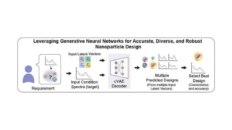 Tandem neural networks for inverse design can only make single predictions, which limits the diversity of predicted structures. Here, we use conditional variational autoencoder (cVAE) for the inverse design of core–shell nanoparticles. cVAE is a type of generative neural network that generates multiple valid solutions for the same input condition. We generate a dataset from Mie theory simulations, including ten commonly used materials in plasmonic core–shell nanoparticle synthesis. We compare the performance of cVAE with that of the tandem model. Our cVAE model shows higher accuracy with a lower mean absolute error (MAE) of 0.013 compared to 0.046 for the tandem model. Robustness analysis with 100 test spectra confirms the improved reliability and diversity of cVAE. To validate the effectiveness of the cVAE model, we synthesize Au@Ag core–shell nanoparticles. cVAE model offers high accuracy in predicting material composition and spectral features. Our study shows the potential of cVAEs as generative neural networks in producing accurate, diverse, and robust nanoparticle designs.